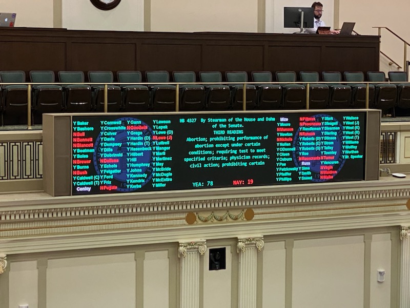 HB4327 passed the House on Tuesday after two hours of questions and debate. If passed into law will be the most restrictive abortion law in the nation. The bill is patterned after the Texas Heartbeat bill which has reportedly cut abortions performed in Texas by 60%. This restriction has driven many of these women seeking abortions to Oklahoma.