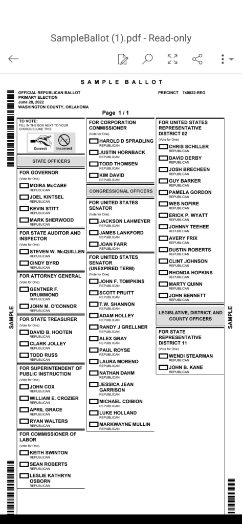 For readers of my first draft you should be aware that my opinion has changed on the following elections: State Superintendent of Public Instruction and the U.S. Senate (Inhofe’s old seat).
